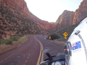 The sixth morning of our 3200km ride from LA to the Sturgis Motorcycle Rally on a Victory Cross Country Tour (photos embargoed until Sunday) started out cool in Zion National Park. A spectacular overnight storm had brought the temperature down to a mild 74F (23C) as indicated on the Victory dashboard. Our refreshingly fresh ride after some scorching desert days begins in the shadowed canyons of the park.