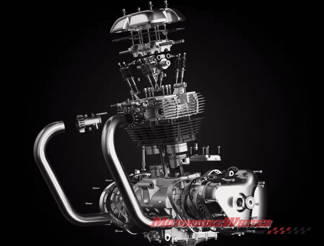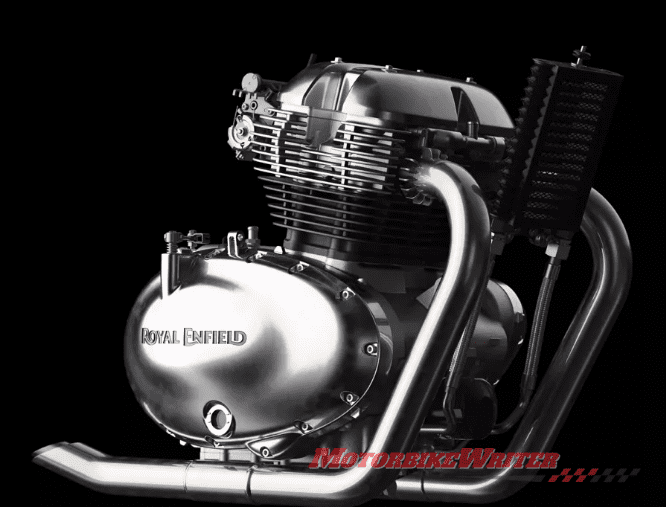 Royal Enfield claims the 648cc, single-overhead-cam, eight-valve, air/oil-cooled parallel twins are married to a six-speed gearbox with assist clutch.