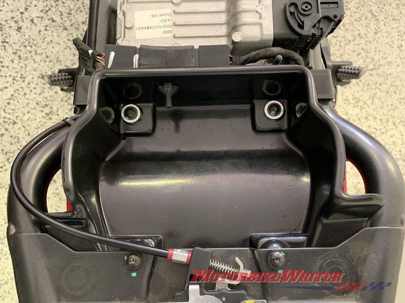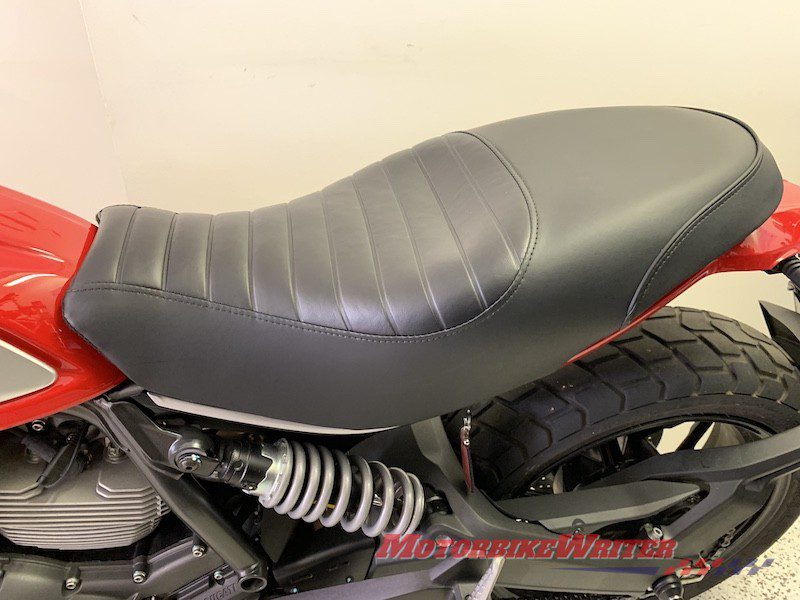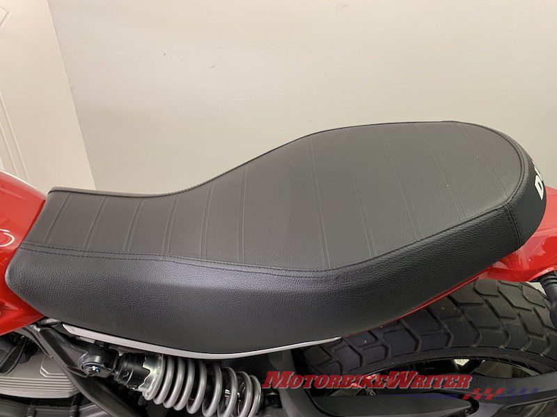 The standard seat is an ugly, flat and uncomfortable piece of plastic with a tacky white “Ducati” on the tail. It looks cheap and nasty and spoils the look and comfort of an otherwise great bike.