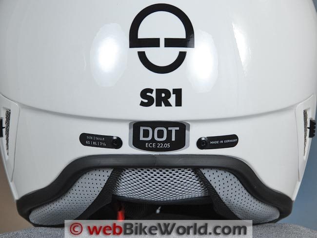 The biggest — and, other than the trim color — difference in the DOT version of the SR1 is the helmet weight. This is apparently due to meeting the FMVSS 218 U.S. DOT helmet safety standard (see my report on the differences between DOT, ECE and Snell helmet safety standards).
