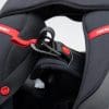 Inside the chin-bar is a large red, rubber bulb and there is an air bladder behind each cheek pad. Presson on the bulb inflates the bladders and snugs the fit at the sides. This can help ensure a good fit and it can also extend the useful length of time the helmet fits well as the padding wears over time.
