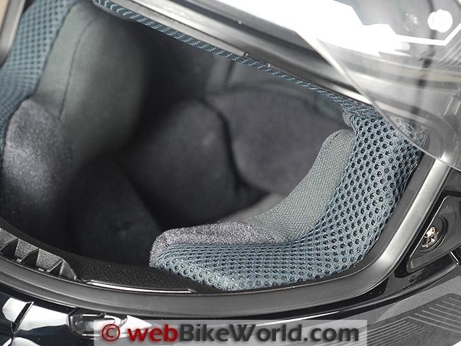 The chin bar in the GT Air is large and wide also and it is backed with nicely finished molded pattern with the Shoei logo.