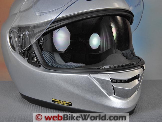 It also has a special shape which allows the largest-sized Pinlock anti-fog insert (review) to be fitted (it is included with the helmet). The large Pinlock insert fits nearly the full width and height of the face shield, which keeps it mostly out of the rider’s field of view.