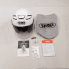 The industry standard Shoei helmet box contained the J-Cruise II Large in White, housed in the standard SHOEI helmet bag, a plastic Service Tool, small bottle of silicone oil, two manuals – How to Use Your Helmet Properly and J-Cruise II User Manual (both multi-language) and two SHOEI decals.