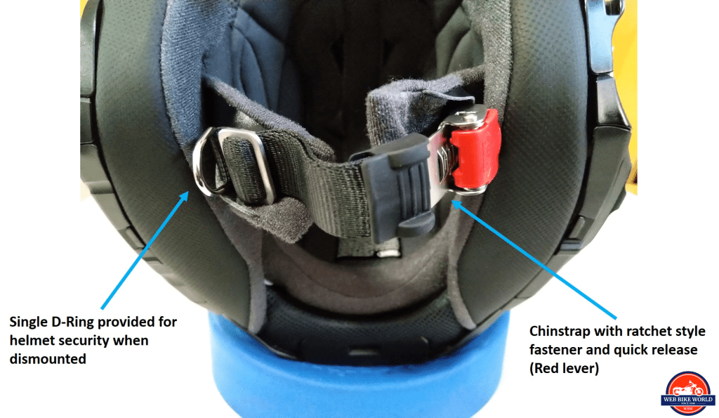 - Closure – new, stainless steel micro ratchet-closure chinstrap, allowing easy use of the chinstrap with gloves on (can be easier than double D-Ring design), a single D-Ring is retained for dismounted security