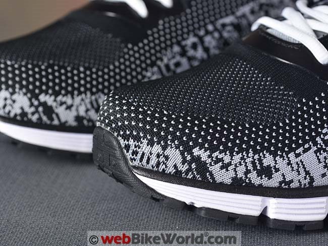 In fact, because of the one-piece knit uppers, the only stitches on the entire show are two rows holding the reflective loop in the rear and a single small row across the front of the vinyl lace reinforcement, at the front of the laces.