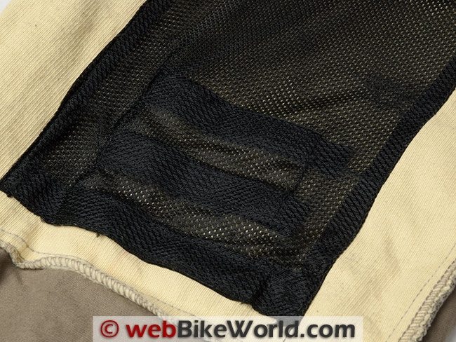 Back to the protective features… There are two mesh pockets sewn into the knee areas for holding optional knee armor. There are multiple strips of hook-and-loop fastener at the top and bottom of these pockets, so that the armor can be adjusted to suit the height of the wearer.