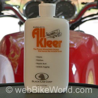 We’ve tried many different visor and windscreen cleaners and polishes (see our Motorcycle Cleaners, Waxes and Polishes home page for a selection of reviews) and our favorites are RejeX, which cleans, polishes and leaves a barrier that helps prevent future build-up and All Kleer, which does a wonderful job, especially on windscreens.