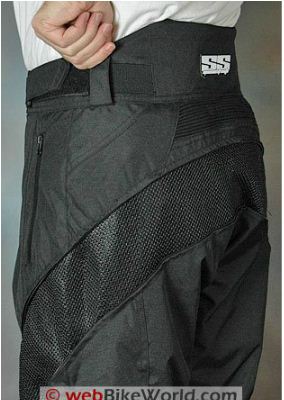 But the Speed and Strength designers thought outside the box to help solve this problem. The more expensive Hell ‘N Back pants have a diagonal panel on either side of the front that reaches from just above the knee to the upper hip. The articulated stretch panel in back of the waist prevents the panel from continuing around the back, as it does on the Coast is Clear pants. This matches the similar removable panel on the Coast is Clear ST jacket (review).