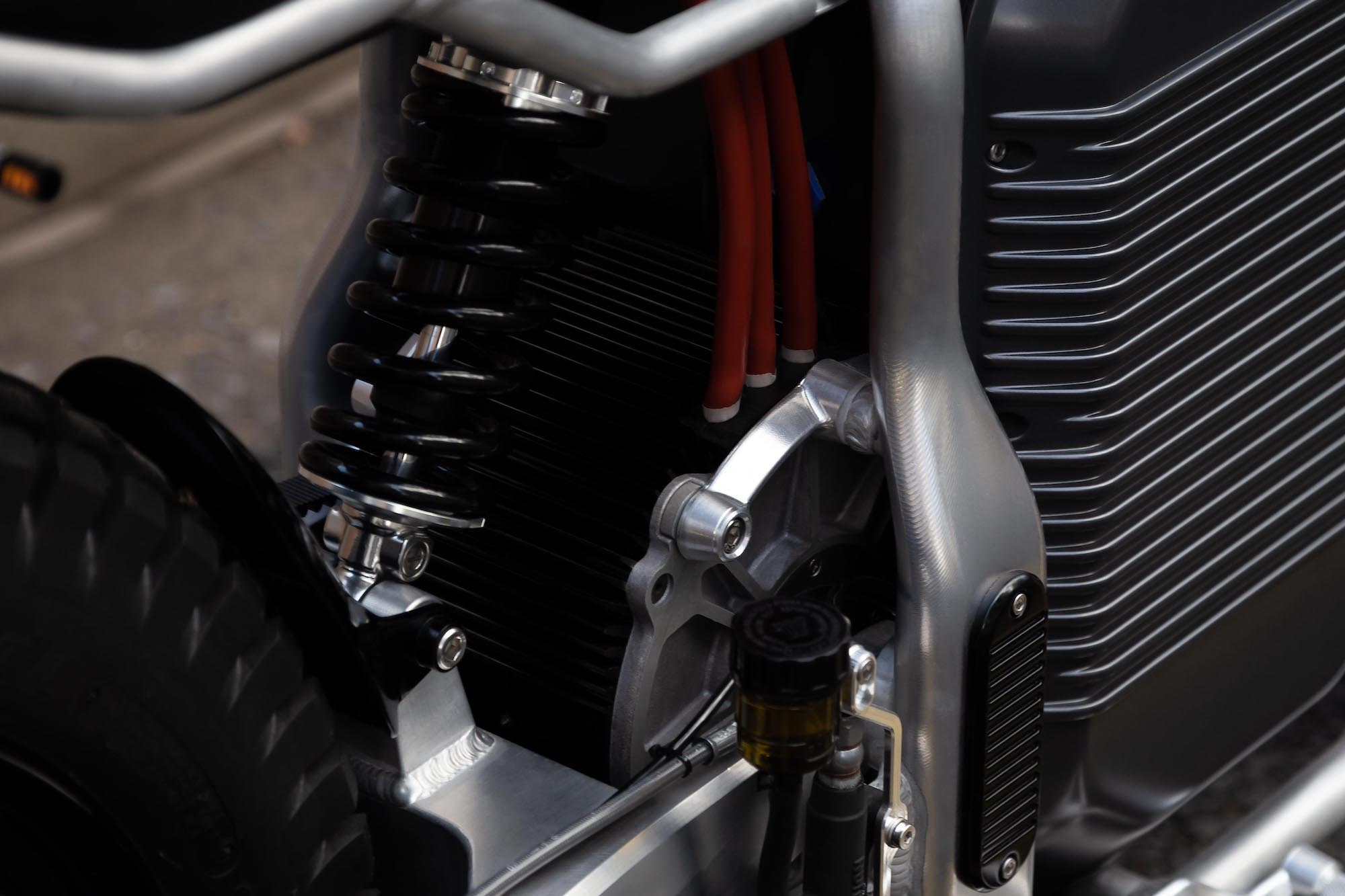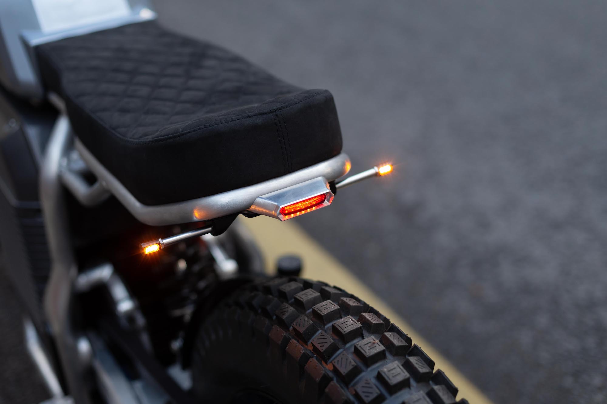 The faux gas tank provides the perfect hidey hole for all the electric components; below, Switch has dressed the 27-degree rake of the eScrambler with an upside-down fork at the front and monoshock at the rear.