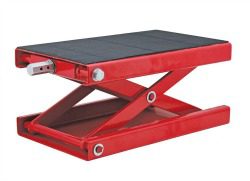 This one does that and much more. It comes with a ramp that enables you to drive the bike onto the lift, where after you can use the central jack to raise it into position and fix it there. The scissor lift is air operated and uses 90-110 PSI minimum.