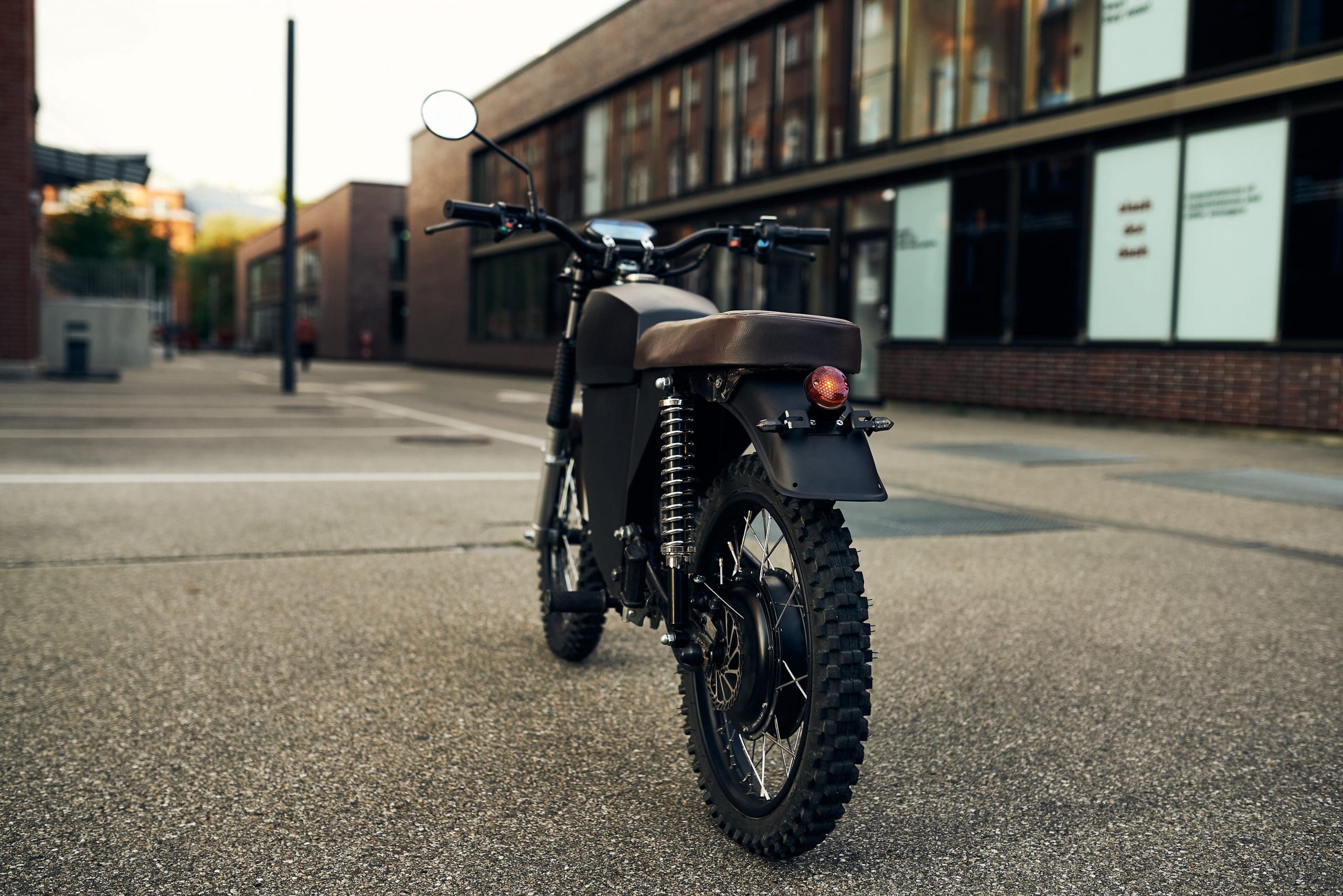 The Moped, as the company calls it, is really a mini-scrambler. The word moped fits the bike because it’s about the size of a moped, but the little bike lacks pedals, so I’m not totally sure it qualifies as a moped. In any event, it’s a cool-looking little bike, and something I would certainly ride around town.