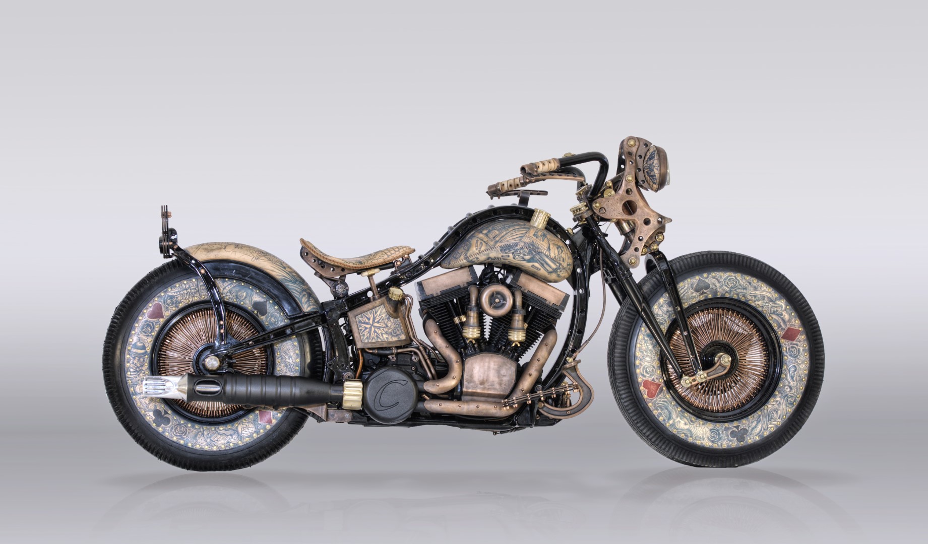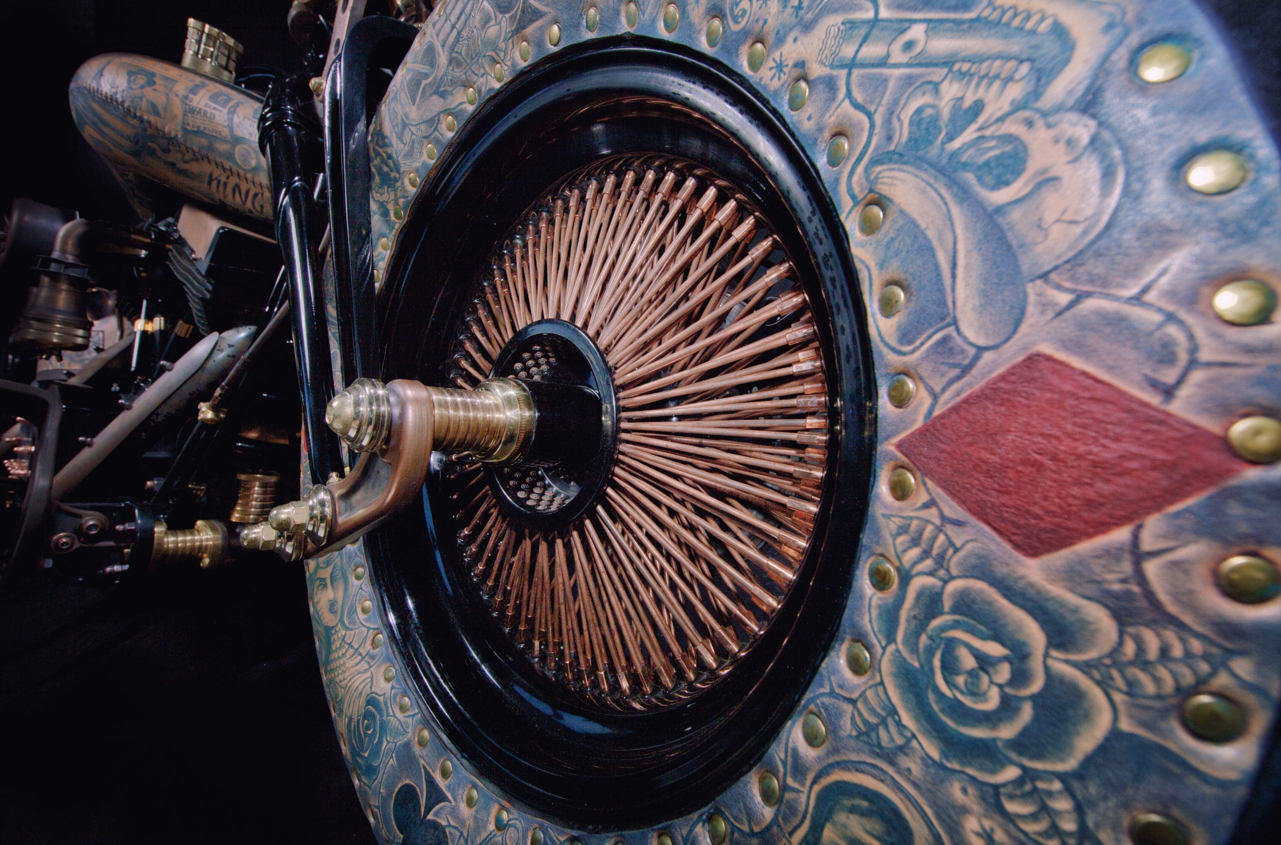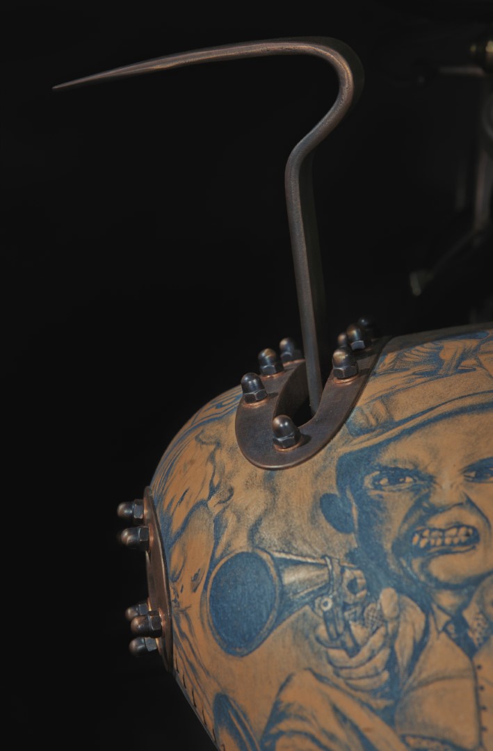 In short, this is a wonderful work of art. It’s interesting and different. Even if you don’t like it you have to acknowledge the craftsmanship and the time and effort that went into making the bike. According to Game Over Cycles, more than 3,000 hours went into the construction of the bike. Another 2,500 hours went into tattooing the leather on the creation.
