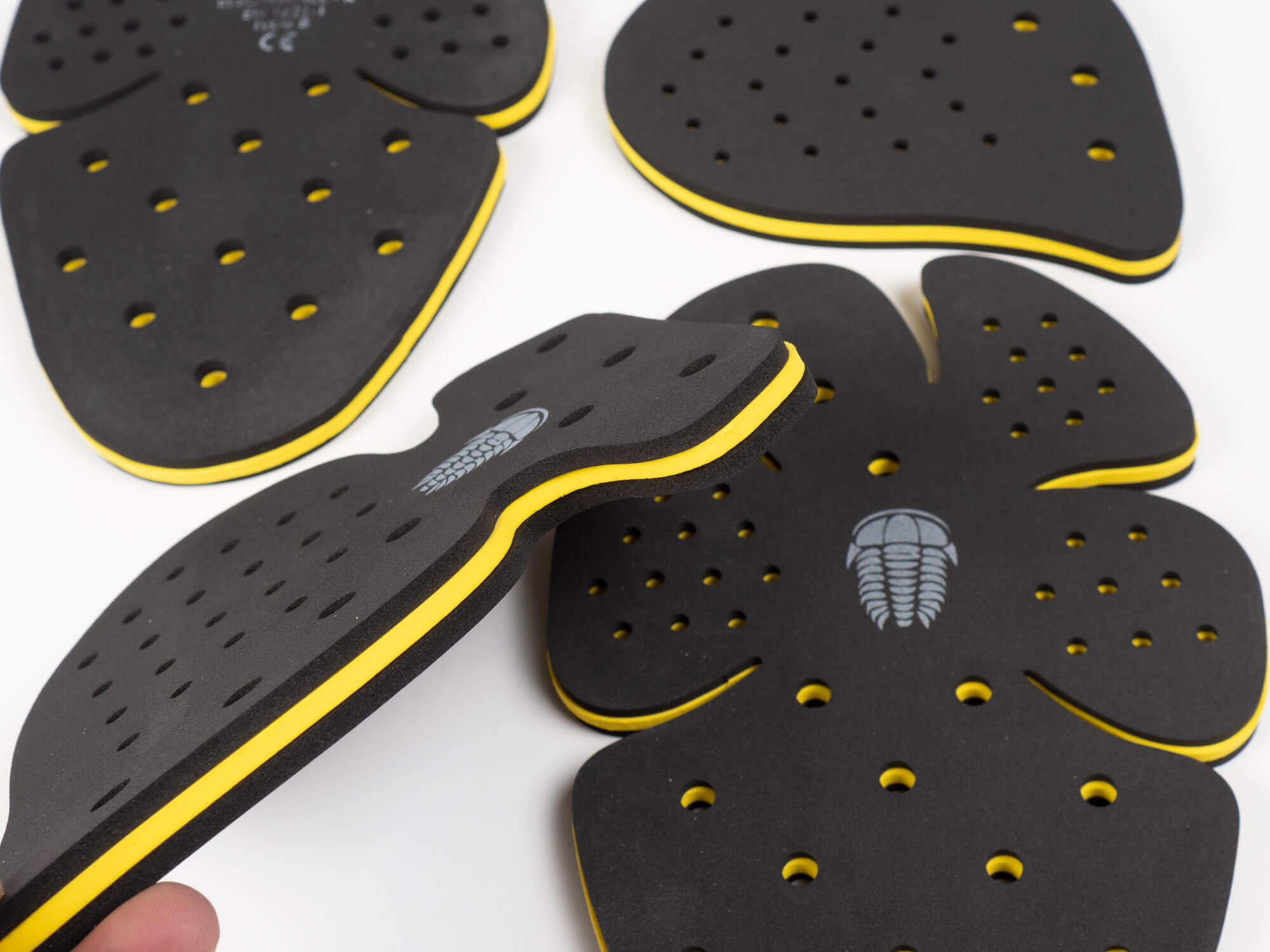 All four pieces are constructed from three layers of foam with the two higher density outer layers sandwiched over a softer inner one. The layers are attached at just a few points which allows the surfaces to slide against each other a bit. This creates very good flexibility and allows the armor to conform to the rider.