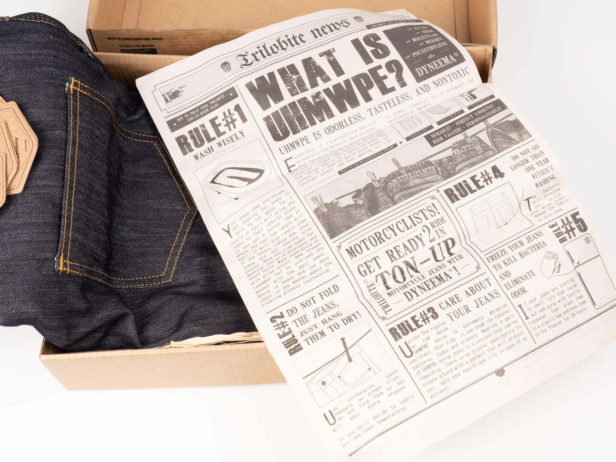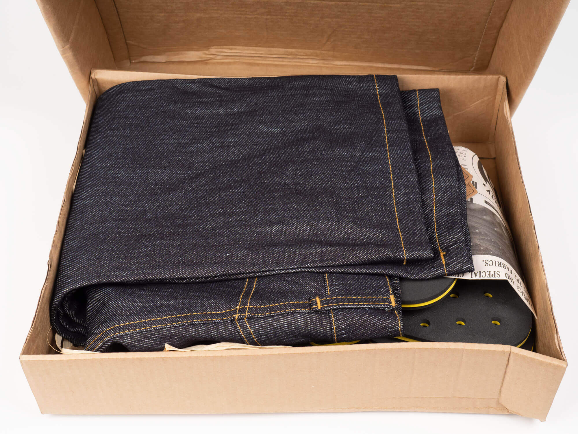 Within the box is a newsprint style page with information about the various aspects of the jeans in the style of a newspaper advertising page from decades long past. It’s cute and there is some interesting information there. Additionally, there are several thick brown tags attached to the jeans via a string that provides more details surrounding features of the jeans.