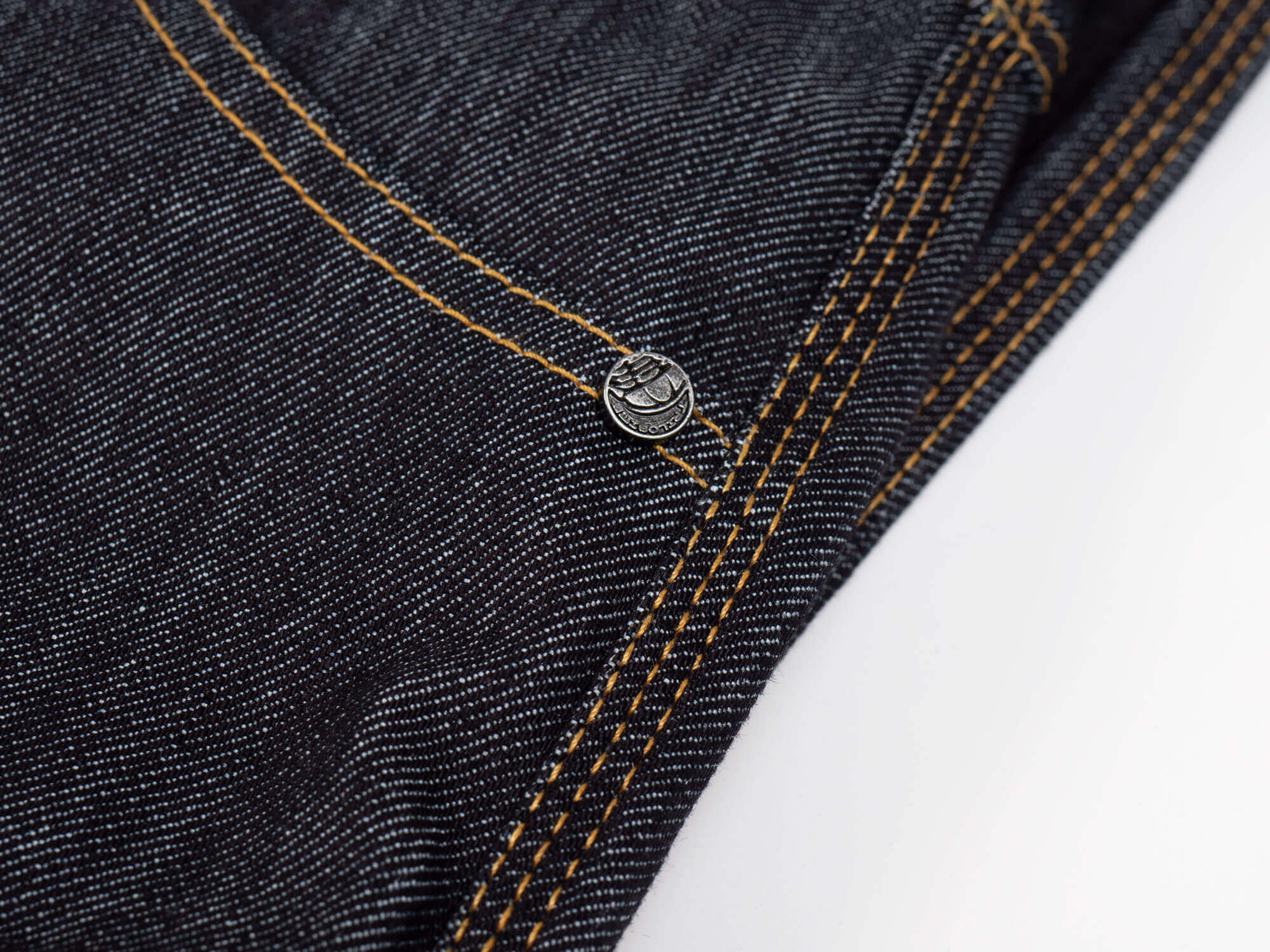 As far as the overall style, they are very much the traditional five pocket jeans on the outside. A zipper (YKK) and large button are used for the main closure. On the left pocket there is a singular rivet at the pocket corner seam embossed with the Trilobite graphics and in the upper portion of the right pocket, a small metal “Trilobite” logo is present.