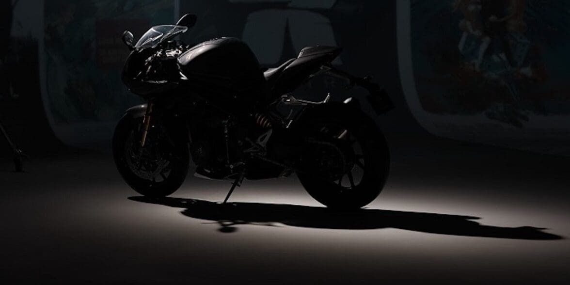The press release shows a dark, moody setting with a shadowy silhouette of a bike – what looks very much like a Speed Triple – in weak spotlight.