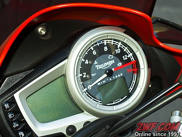 The Triumph’s instrument panel features an analogue tach, digital speedo and clock, lap timer and gear indicator. Overall it’s a good looking unit and I like the added touch of the gear change warning lights that start to light up in progression as you pass 10,000 RPM.