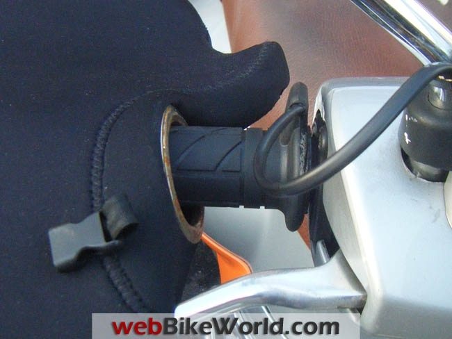 When using heated grips without muffs, your palms get warm — sometimes uncomfortably so — but the back of the hands still suffer wind chill. With the muffs and the heated grips, not only is the wind chill factor removed but the grips warm up the insides of the muffs, creating very cosy little cocoons for your hands.