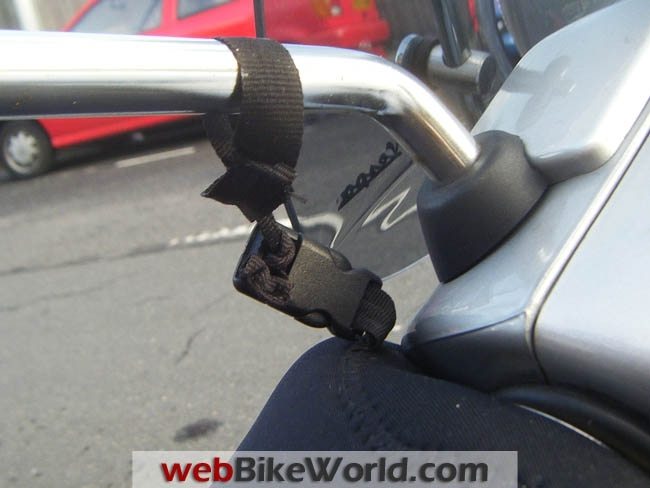 On a recent outing, a friend riding behind me observed that my brake light occasionally flashed when I couldn’t have been braking. I concluded that at speed (60mph+) the muff had been forced back by the wind and pressed on the brake lever.