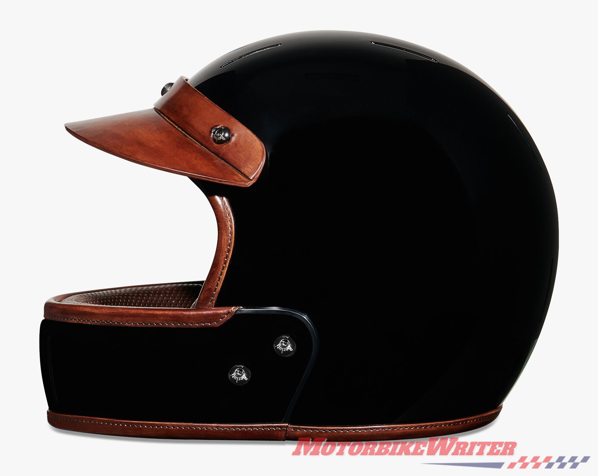 It features a carbon fibre shell and “patinated” (aged) Venezia leather on the peak and around the visor opening and the bottom of the helmet.