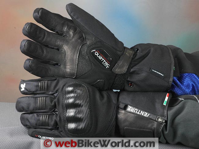 The VQuattro Venture gloves (photo below) are textile with leather palms, designed for wet-weather riding. In addition to Primaloft insulation and the waterproof/breathable liner, they include a double-cuff liner system and Outlast phase-change lining system.