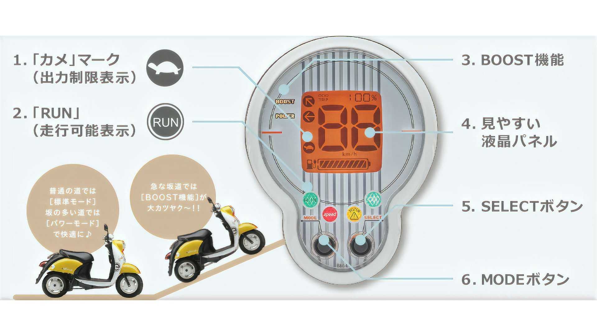 The power will be roughly 50cc scooter equivalent, and there are two power modes, Standard and Power. There’s also a little boost function that gives you some extra juice for 30 seconds. This is supposed to be good for hills. I’m not seeing top-speed specs or acceleration numbers at this time, but you can expect them to be low and slow.
